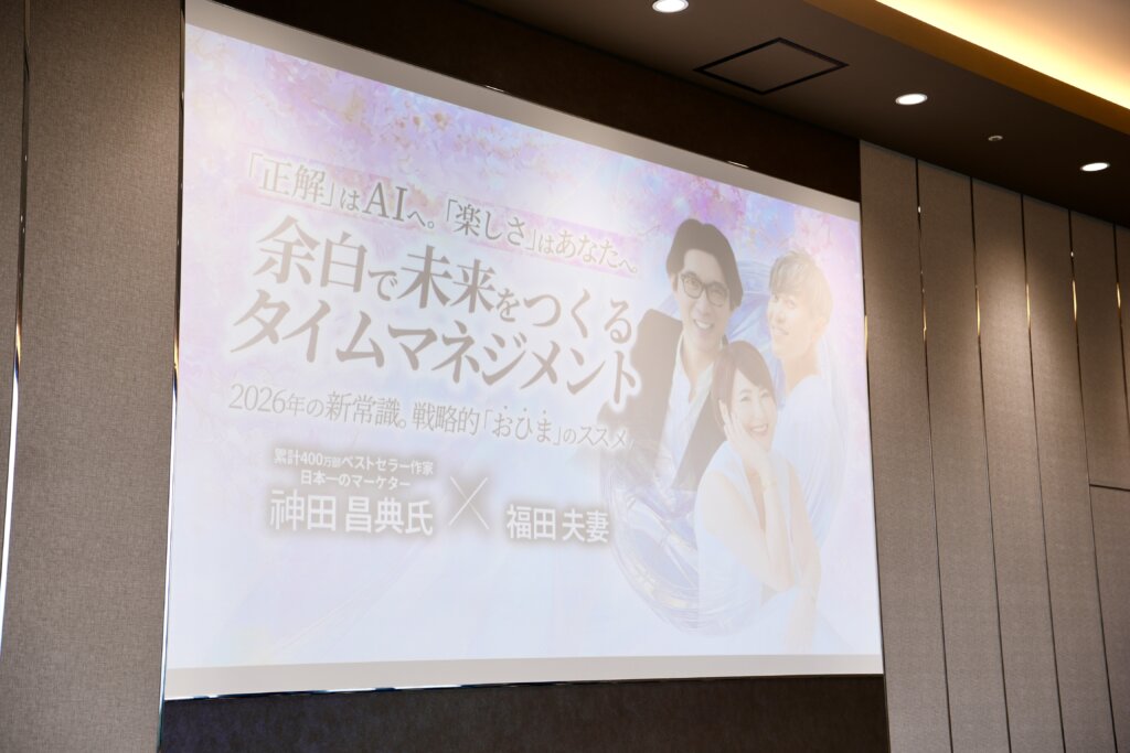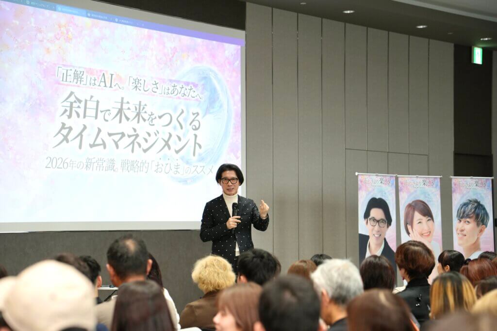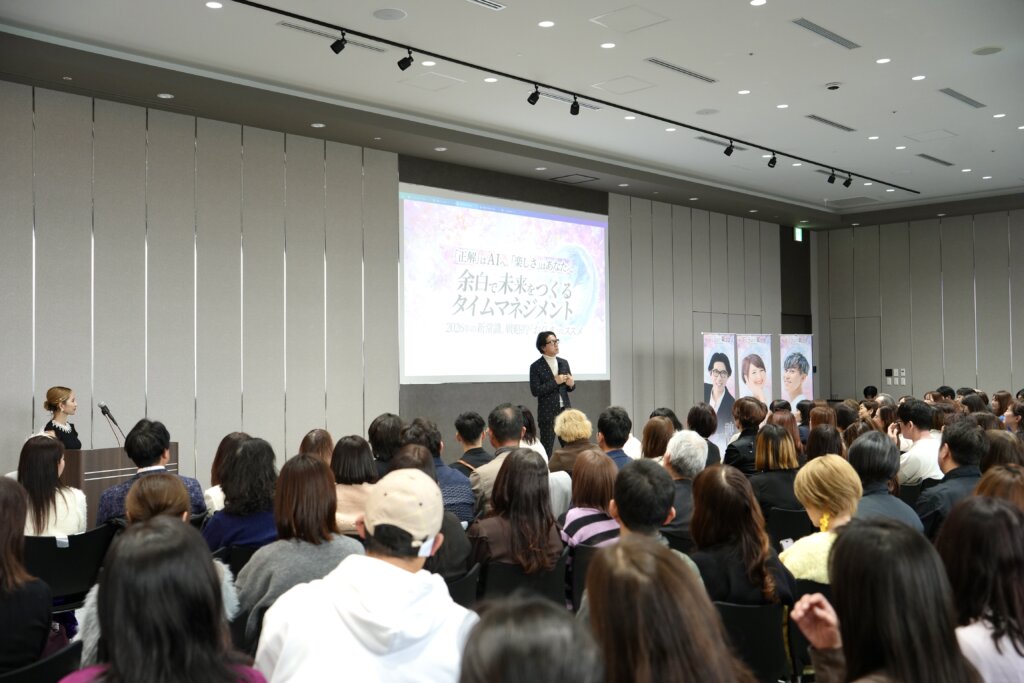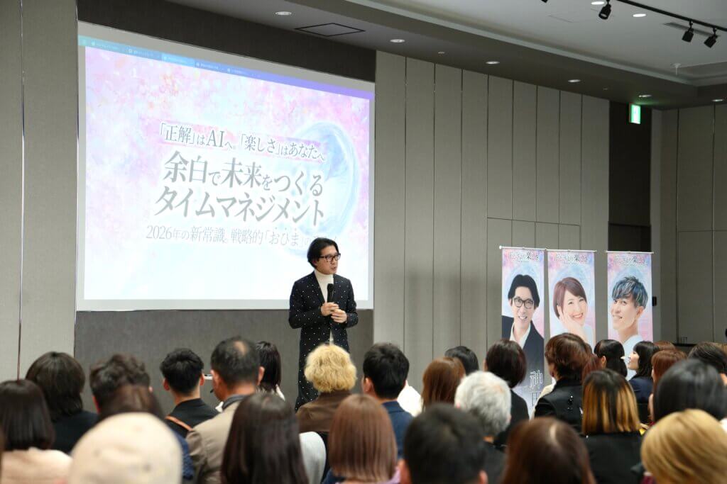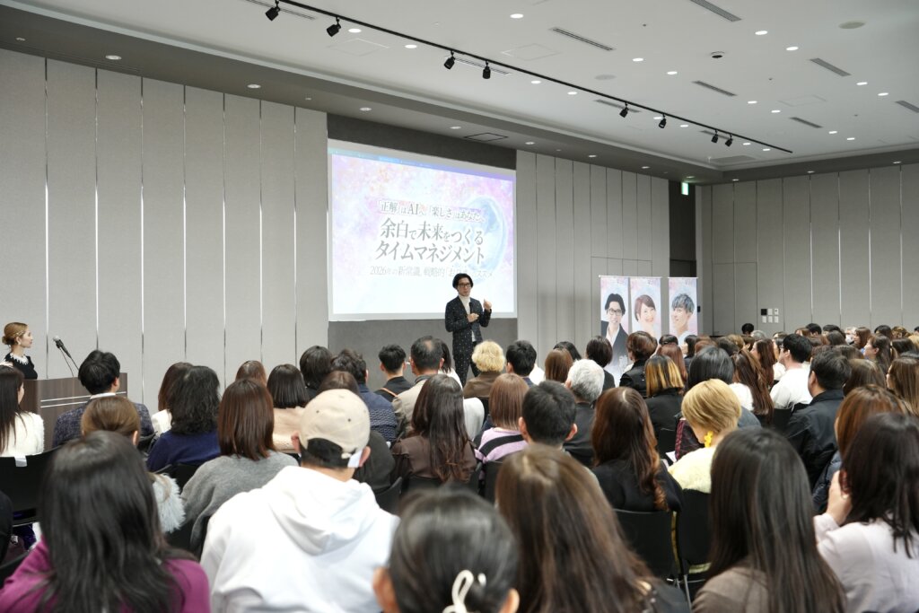 この問いに向き合えるようになってきました。ここ、すごく大事なんですけど、正直に言うと、AIが登場してからも「働き方そのものが激変した!」という感覚は、社長である福田麻紀はそこまでありません。でも一方で、スケジュールには驚くほど“余白”ができた。それでも、ちゃんと物事は回っている。むしろ前より進んでいる。この“余白”こそが、誰よりも遠くの未来を見据えて、自分が動かなくても成果が出る流れを設計してきた結果だと、私たちは考えています。だからこそ、私たちは2026年の新常識として、「余白で未来をつくるマネジメント」 を講演会の場で提唱。今回の講演会はそのスタート地点でした。