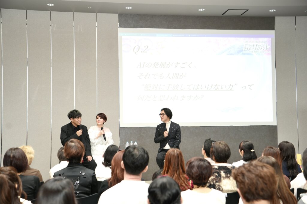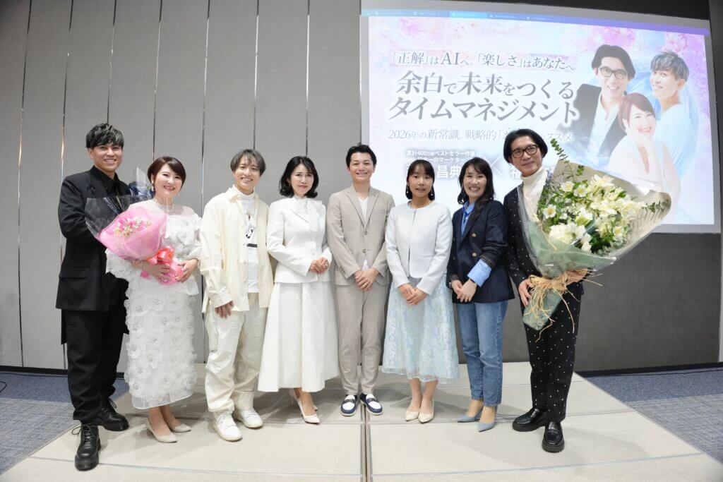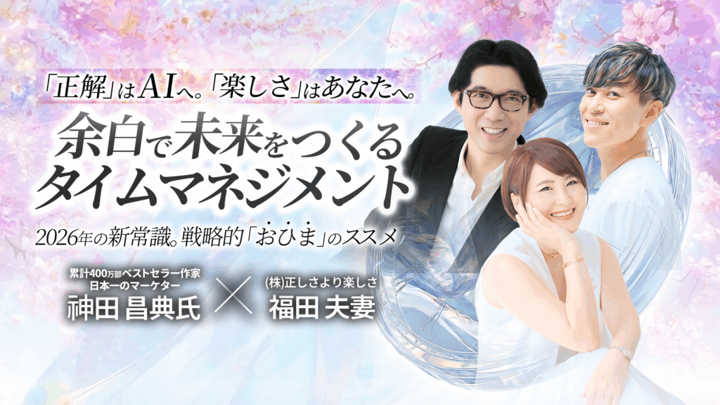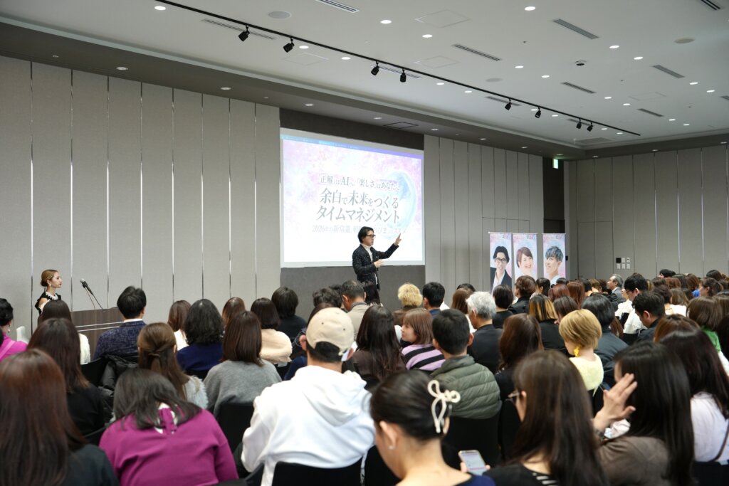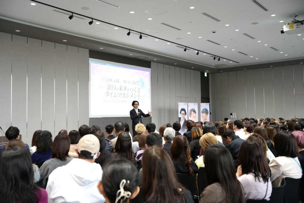 この問いに向き合えるようになってきました。ここ、すごく大事なんですけど、正直に言うと、AIが登場してからも「働き方そのものが激変した!」という感覚は、社長である福田麻紀はそこまでありません。でも一方で、スケジュールには驚くほど“余白”ができた。それでも、ちゃんと物事は回っている。むしろ前より進んでいる。この“余白”こそが、誰よりも遠くの未来を見据えて、自分が動かなくても成果が出る流れを設計してきた結果だと、私たちは考えています。だからこそ、私たちは2026年の新常識として、「余白で未来をつくるマネジメント」 を講演会の場で提唱。今回の講演会はそのスタート地点でした。