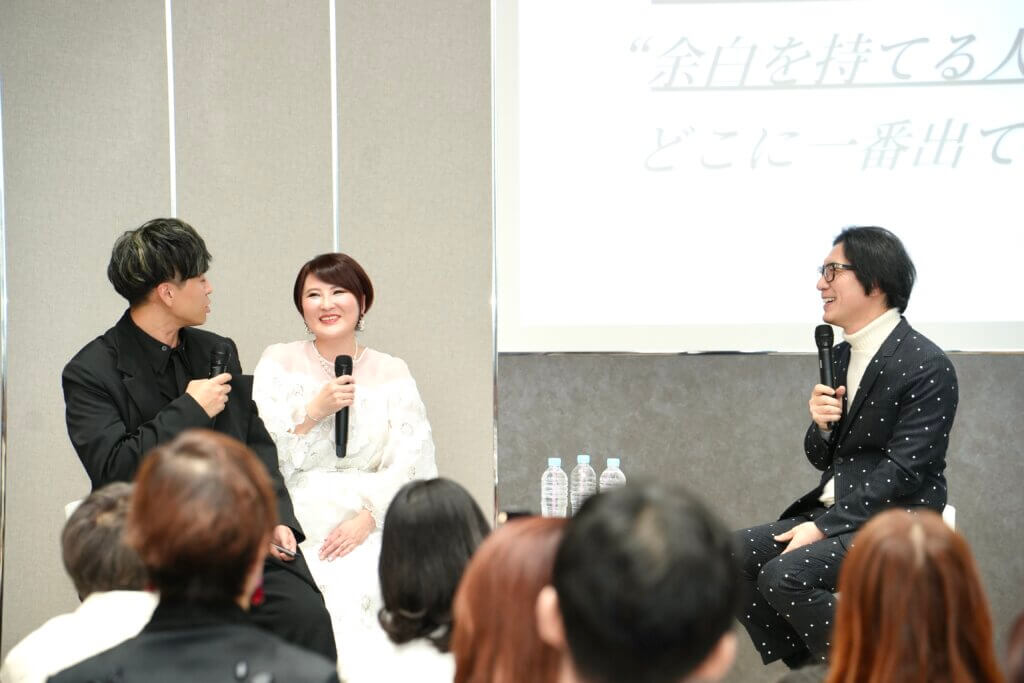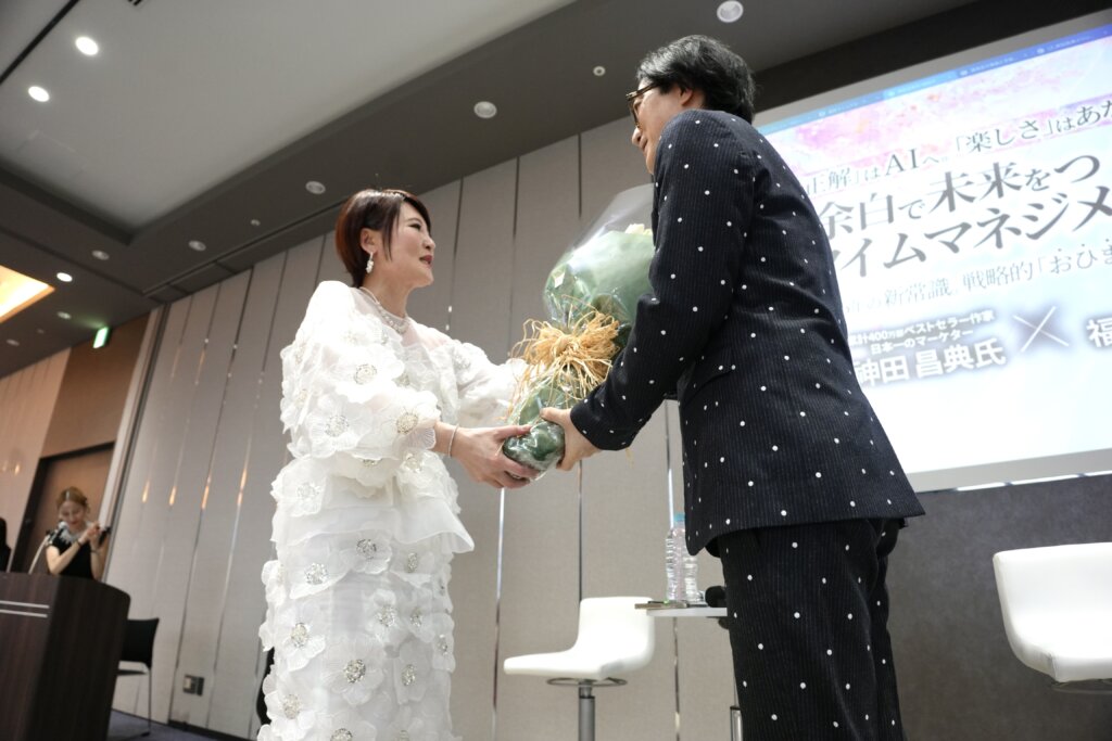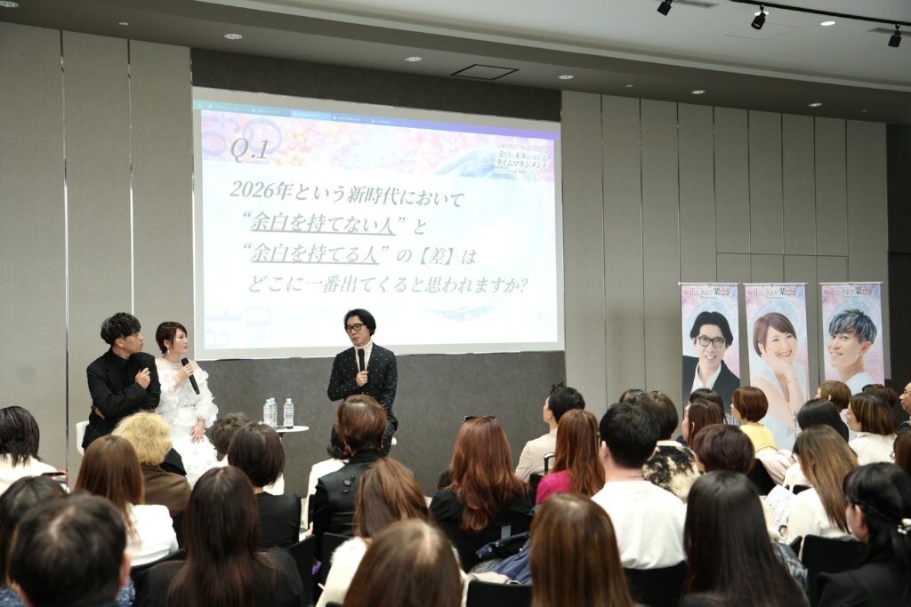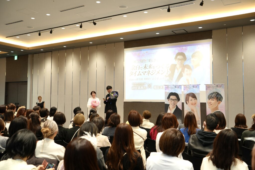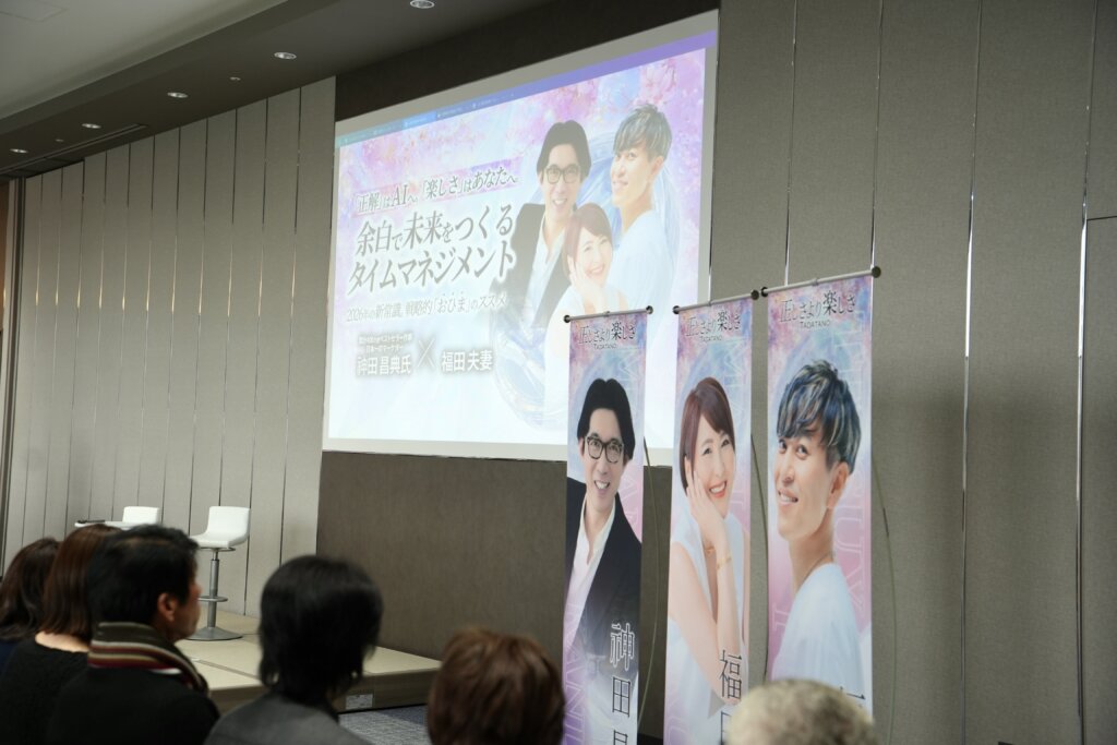今回のハイライトのひとつが、神田昌典さんと福田夫妻による記念対談でした。この対談では、ノウハウの話だけではなく、これからの時代における働き方・時間の使い方・人間の価値の出し方について、深い視点が交わされました。特に多くの方の心に残ったのが、「余白」というテーマです。講演会後、僕らのもとには、